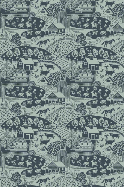 Our Gable papers are playful, pastoral and utterly charming. Depicting traditional village and farmyard scenes with clean, modern styling, its large scale statement pattern is studded with little details that spark the imagination, taking on added character as you look.