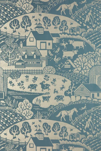 Our Gable papers are playful, pastoral and utterly charming. Depicting traditional village and farmyard scenes with clean, modern styling, its large scale statement pattern is studded with little details that spark the imagination, taking on added character as you look.