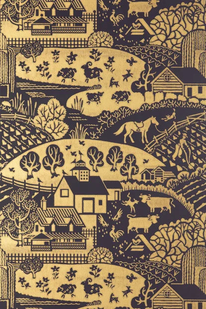 Our Gable papers are playful, pastoral and utterly charming. Depicting traditional village and farmyard scenes with clean, modern styling, its large scale statement pattern is studded with little details that spark the imagination, taking on added character as you look.